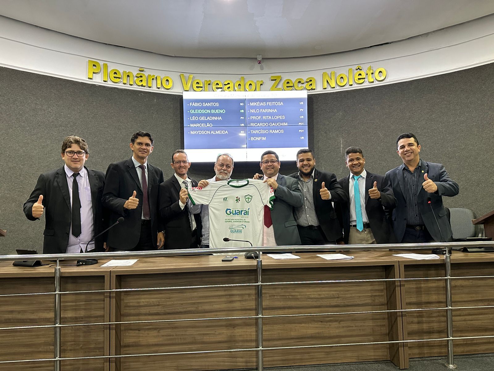 Diretor do Sport Clube Guarai, presenteando os vereadores com a camiseta do lobão